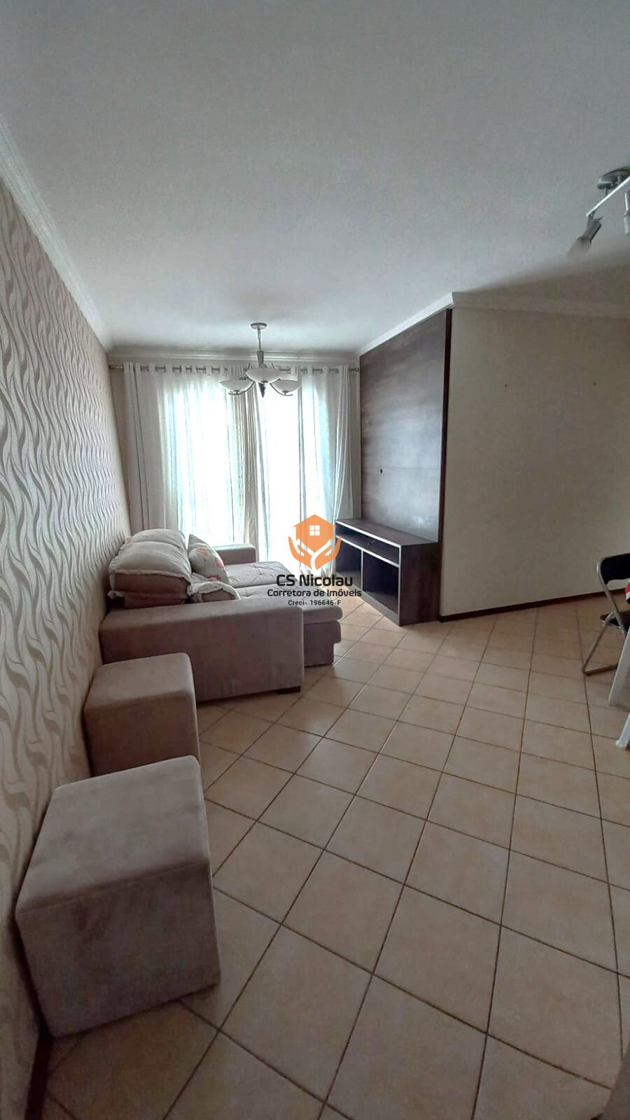 Sala dois ambientes com painel de TV,