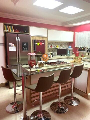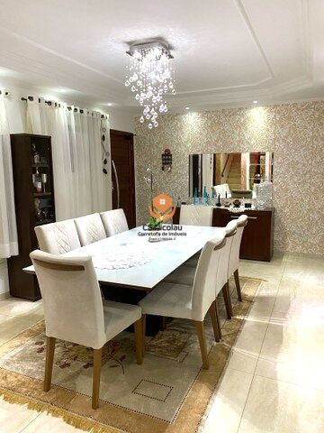 Pisos em porcelanato na sala de jantar, cozinha e área de luz e sala superior. Quartos com pisos laminados. Escada em mármore travertino com corrimão e grade em aço.